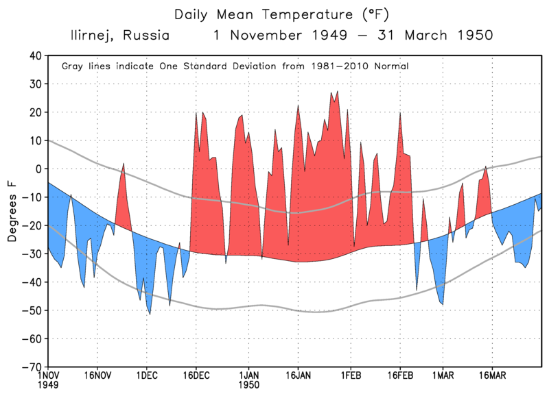4:22 PM GMT on March 15, 2016Here's one (since you asked): Ilirnej, Russia, in the winter of 1949-1950. This is a long-term reporting site in eastern Siberia, part of the Global Climate Observing System network. The chart below shows the daily mean temperatures that winter, compared to the 1981-2010 normal (not the contemporary normal). The Dec-Feb mean temperature was 12.5C above the modern normal.