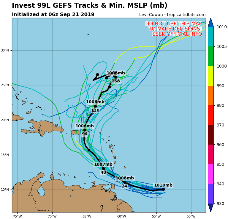 | Figure 1. Predicted path of 99L from the 6Z Saturday, September 21, 2019, run of the GFS model (thick black line) and its ensemble members (thin lines). 99L was predicted to take a path through the Windward Islands on Sunday, then turn north and affect Puerto Rico and the Virgin Islands by Tuesday. Image credit: tropicaltidbits.com. |