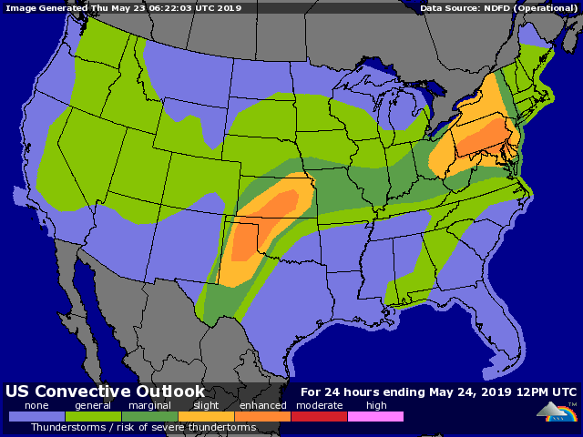 | Figure 1. Severe weather outlook issued early Thursday, May 23, 2019, valid through 7 am CDT Friday. |