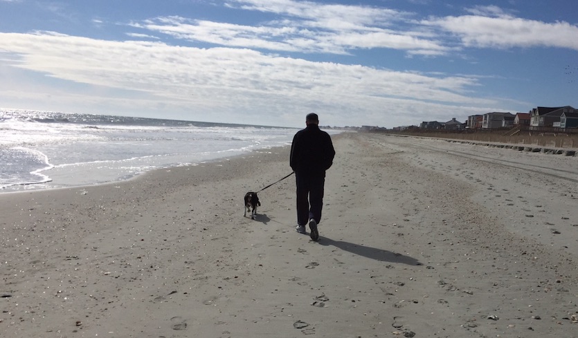 | Figure 3. Walking on the beach with my dog, whom we rescued in 2014, in South Carolina on a February day. Even during winter, the temperature in South Carolina can get into the 70s on sunny days, and my wife and I would never consider leaving our dog alone in a parked car. |