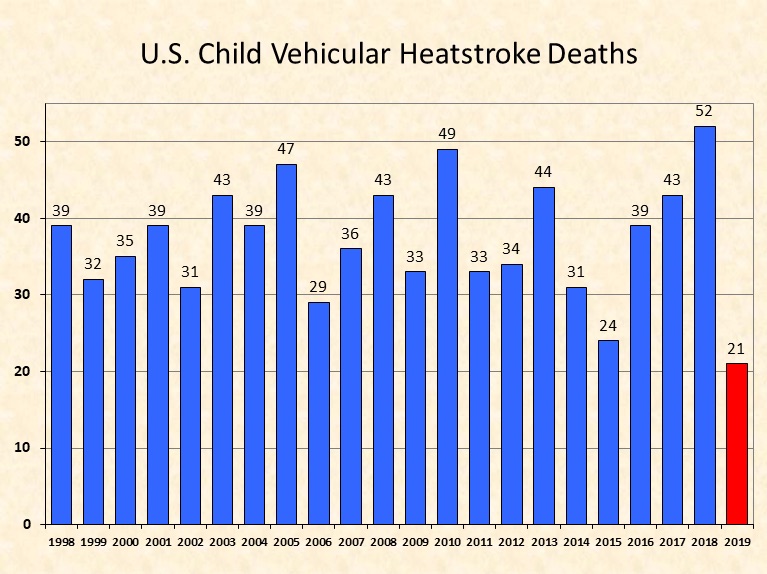 | Figure 1. Annual number of deaths caused by Pediatric Vehicular Heatstroke (PVH) from 1998 into July 2019. Image credit: NoHeatStroke.org |