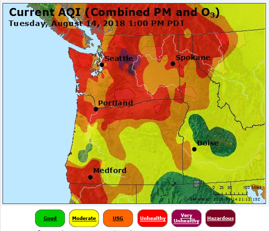 | Figure 3. The Air Quality Index (AQI) was in the “unhealthy” range (red) across much of Northwest U.S. and southwestern Canada due to wildfire smoke at 1 pm PDT Tuesday, August 14, 2018. At two monitors in central Washington, the AQI was in the “hazardous” (maroon) range. Image credit: EPA/AirNOW. |
