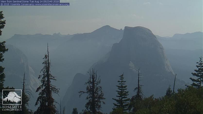 | Figure 2. Yosemite’s iconic Half Dome lies shrouded in wildfire smoke in this webcam view taken at 9:23 am PDT August 14, 2018; Image credit: Yosemite Conservancy. |