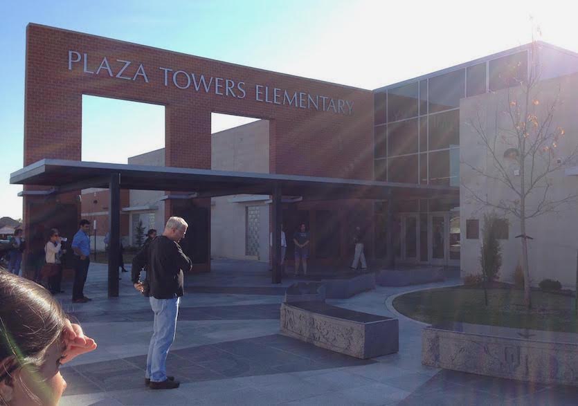 | Figure 3. The rebuilt Plaza Towers Elementary School includes a set of inlaid artwork on benches and outdoor walls that serve as tributes to the children who lost their lives in the tornado on May 20, 2013. Image credit: Bob Henson. |