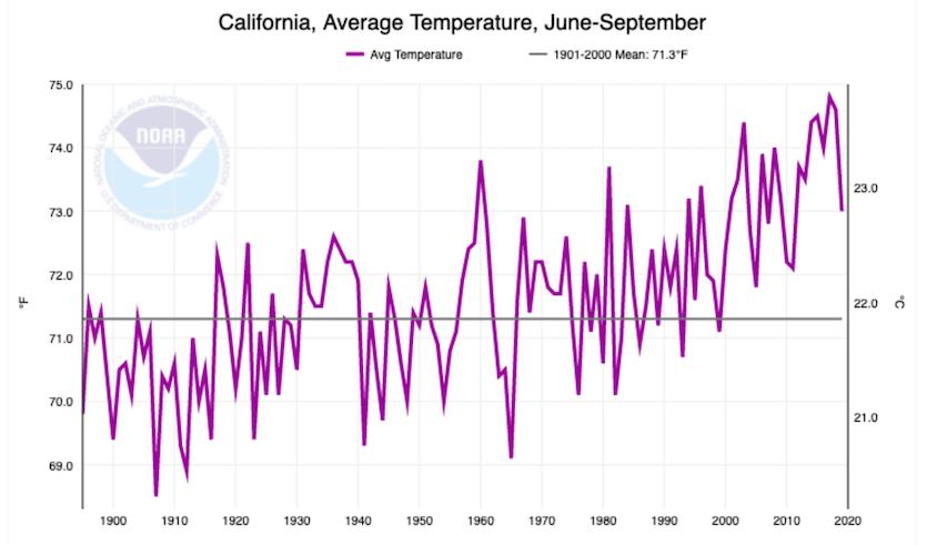 | Figure 3. Temperatures in California for the period June through September have warmed by about 3°F since 1895, roughly twice the national and global trend for the same period. Image credit: NOAA/NCEI. |