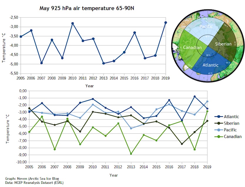 | Figure 1. Last month was the warmest May on record for Arctic surface air temperatures between 65°N and 90°N, with an average of -2.77°C beating the previous record of -2.81°C in 2010. The most extreme warmth was in the Pacific and Canadian sectors. Image credit: Neven Curlin/Arctic Sea Ice Forum, data from NOAA Earth System Research Laboratory. |