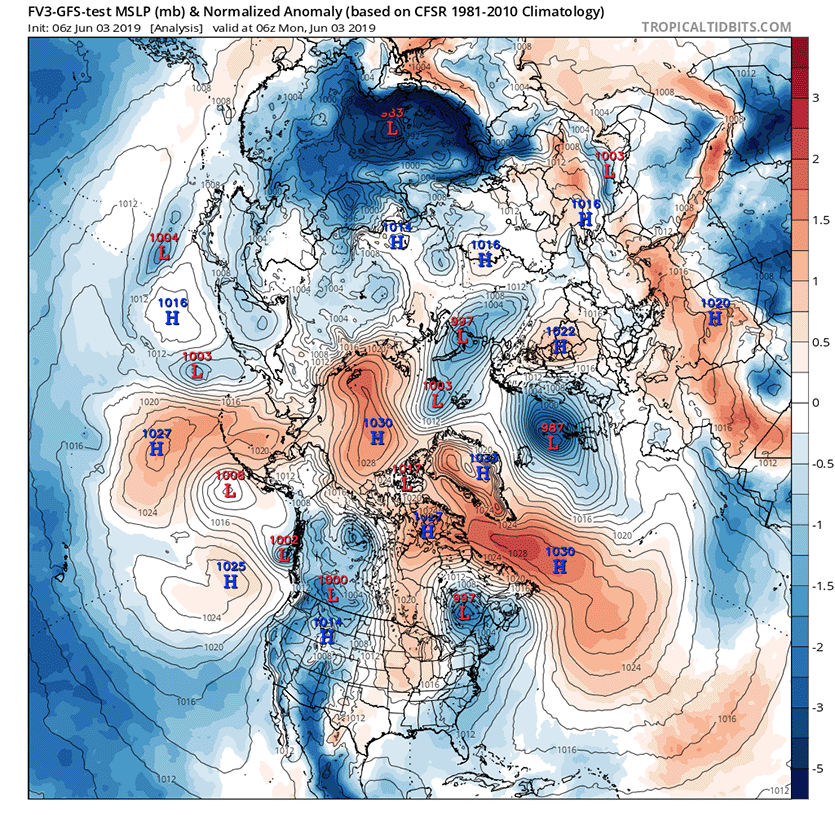 Figure 2. Analyzed surface pressure (black lines) and departure from average pressure in standard deviations (colors) for 6 am EDT Monday, June 5, 2019, from the 6Z Monday run of the GFS-fv3 model. An unusually strong 1030 mb high pressure system was centered over the North Pole (center of image). The orange colors showed that this high was up to 2 standards deviations stronger than average. Image credit: tropicaltidbits.com. |