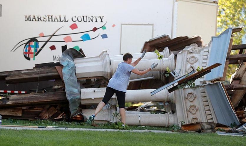 | Figure 1. Marshalltown, Iowa suffered the loss of this iconic 16-foot cupola on top of the Marshall County Courthouse, which fell 175 feet to the ground during the July 19, 2018 tornado. Image credit: AP Photo/Charlie Neibergall. |