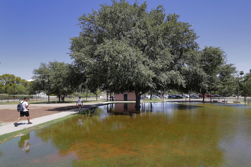 | Figure 4. An irrigation-flooded park keeps a grassy area alive on August 27, 2019, in Tempe, Arizona, during one of the city’s driest summers on record. Image credit: AP Photo/Matt York. |