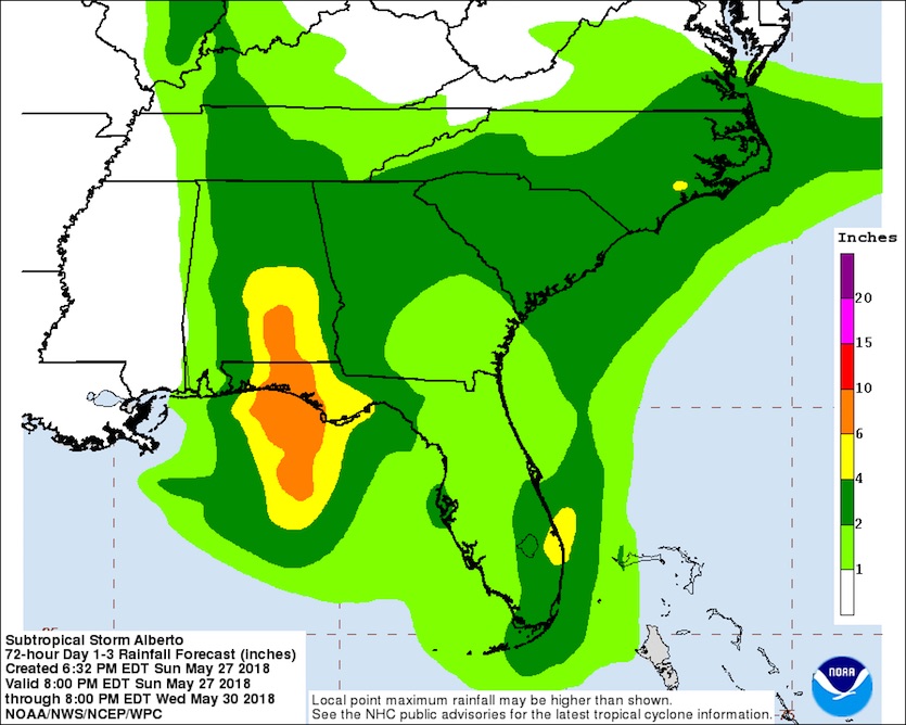 Heavy rains will be the main threat from Alberto. A swath of 4-10” totals is predicted close to the center of Alberto as it moves from south to north into central Alabama. The broad circulation associated with Alberto will also produce a second swath of widespread 2-4” rain, with larger totals locally, across South Florida as well as northern Georgia and the Carolinas.