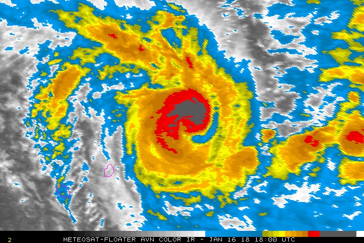 | Figure 3. Tropical Cyclone Berguitta as of 1800Z Tuesday, January 16, 2018. Image credit: Meteosat, via NOAA/NESDIS. |