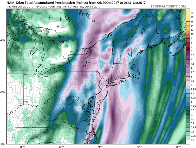 | Figure 2: Total 48-precipitation forecast for the period 2 am Sunday, October 29 – 2 am Tuesday, October 31, from the 2 am EDT Sunday, October 29, 2017 run of the NAM model. Rainfall amounts in excess of 2” (purple colors) were predicted over much of the Northeast U.S. Image credit: tropicaltidbits.com. |
