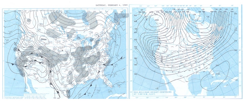 | Figures 1 and 2. Surface (left) and upper-level (right) weather maps valid at 12Z (7 am EST) February 4, 1989. The upper-level map shows the height (in decameters) of the 500-millibar pressure surface . Note that Eureka is reporting snow showers at this time (4 am PST) and that a 1056-mb surface high pressure dome sits over British Columbia. This is the type of scenario that can bring coastal snowfall to northern and central California. Image credit: NOAA/NWS. |