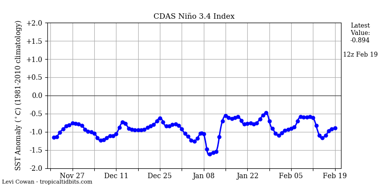 | Figure 2. Sea surface temperatures (SSTs) in the benchmark Niño 3.4 region (in the equatorial Pacific) have hovered around the 1°C below average threshold over the past week; SSTs of 0.5°C or more below average in this region are required to be classified as weak La Niña conditions. Image credit: Levi Cowan, tropicaltidbits.com. |