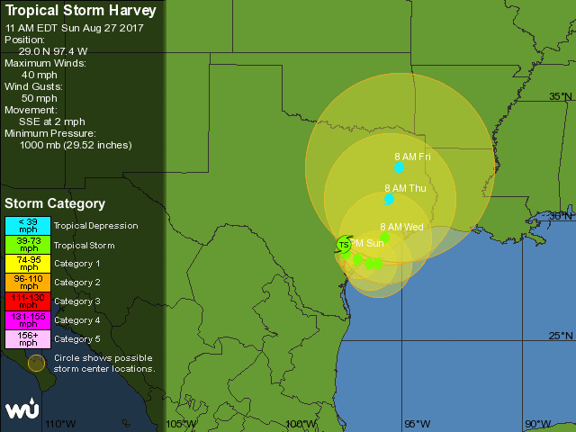 | Figure 3. WU depiction of NHC 5-day outlook for Hurricane Harvey as of 10:00 am CDT Sunday, August 27. The concentric circles indicate how slowly Harvey is expected to move until at least Wednesday. |