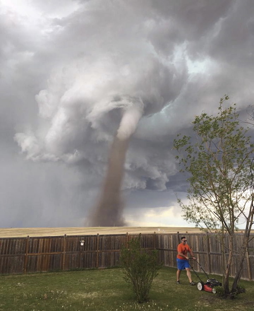 | Figure 5. In this Friday, June 2, 2017, photo provided by Cecilia Wessels via The Canadian Press, Theunis Wessels mows his lawn at his home in Three Hills, Alberta, as a tornado swirls in the background. Cecilia Wessels, who took the image of her husband to show the tornado to her parents in South Africa, said that the twister wasn't as close it appears. Image credit: Cecilia Wessels/The Canadian Press via AP. |