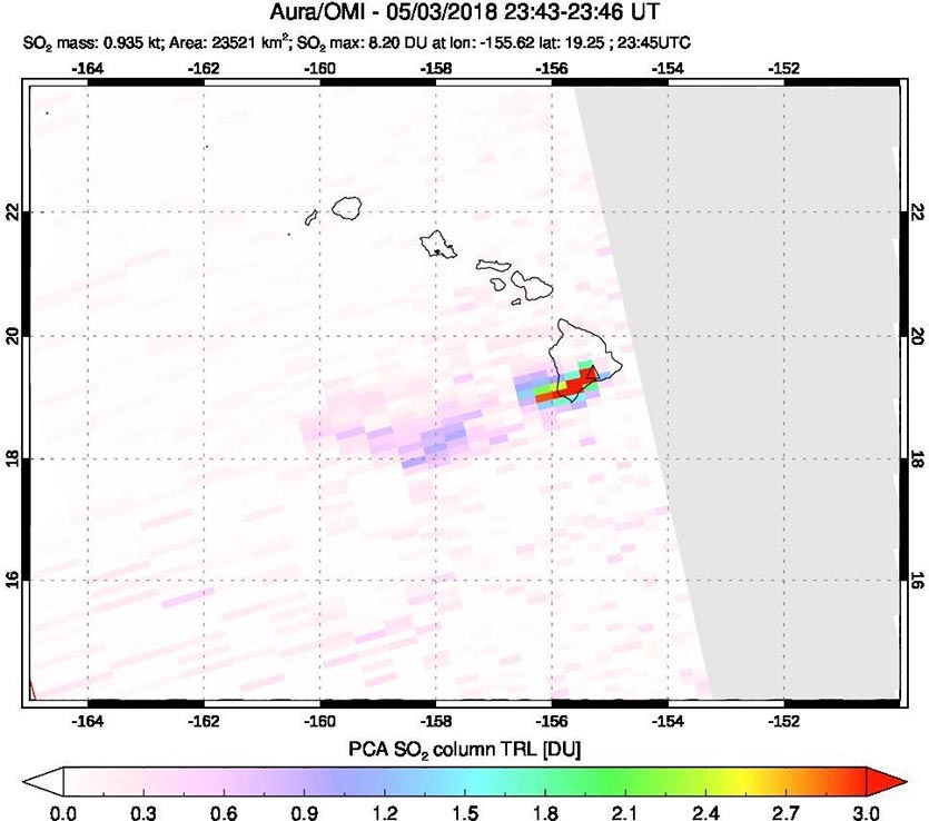 | Figure 2. Enhanced concentrations of sulfur dioxide gas over Hawaii’s Big Island, as measured between 1:30 and 2:00 pm local time on Thursday, May 3, 2018, by the Aura satellite. Northeast trade winds were pushing the gas plume toward the southwest. See the Forbes post by Marshall Shepherd for more details. Image credit: NASA. |