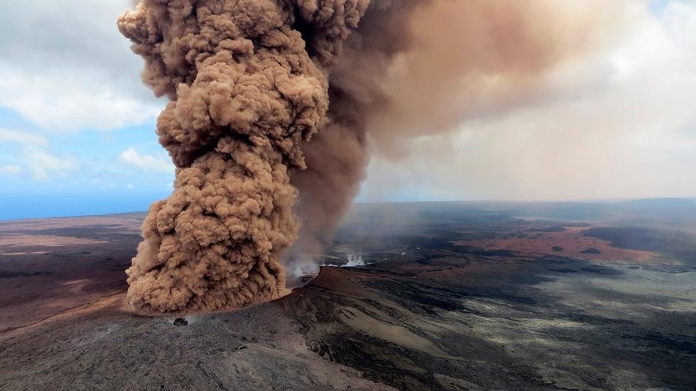 | Figure 3. A column of reddish-brown ash pours out of Mt. Kilauea on Friday, May 4, 2018, at 12:46 pm local time, shortly after a magnitude-6.9 earthquake—Hawaii’s strongest in more than 40 years—shook the Big Island. Image credit: U.S. Geological Survey via AP. |