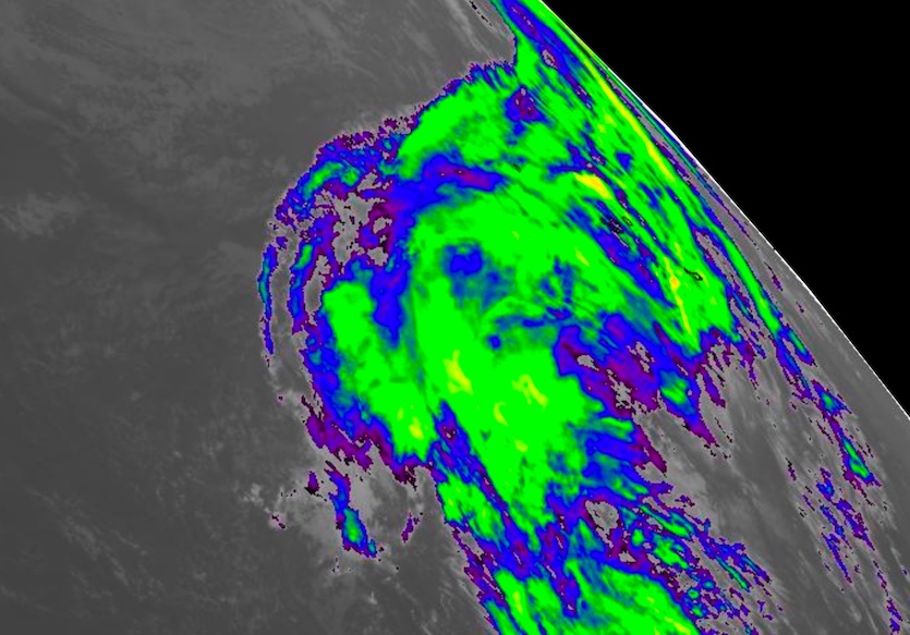 | Figure 3. Showers and thunderstorms stream eastward from a non-tropical low located in the Central Atlantic between Bermuda and the Azores at 2 pm EDT Monday, October 30, 2017. Image credit: NASA/MSFC Earth Science Branch. |