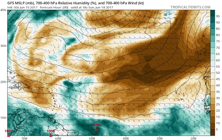 | Figure 3. The operational GFS model from 00Z Thursday, June 15, 2017, brings the tropical wave into the western tropical Atlantic by 2 pm EST Sunday, June 18. The 1006 mb low at the bottom center of the image suggests that the wave could be at depression strength by this point. Relative humidity from about two to four miles above ground (700-400 mb) is predicted to remain quite low just to the north of the system, in the Sahara Air Layer (yellow and brown colors), but conditions are predicted to remain very moist in the immediate vicinity of the system. Image credit: tropicaltidbits.com. |