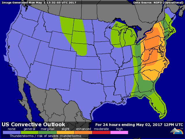 | Figure 1. NOAA/NWS/SPC outlook for severe weather on Monday, May 1, 2017, updated at 8:00 am CDT. |