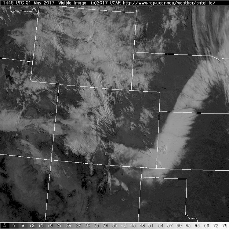 | Figure 6. The band of heavy snow left across the High Plains by Sunday's blizzard, extending from the Texas Panhandle to Nebraska, pops out dramatically on this visible satellite image from Monday morning, May 1, 2017. Image credit: NCAR/RAL Real-Time Weather Data. |