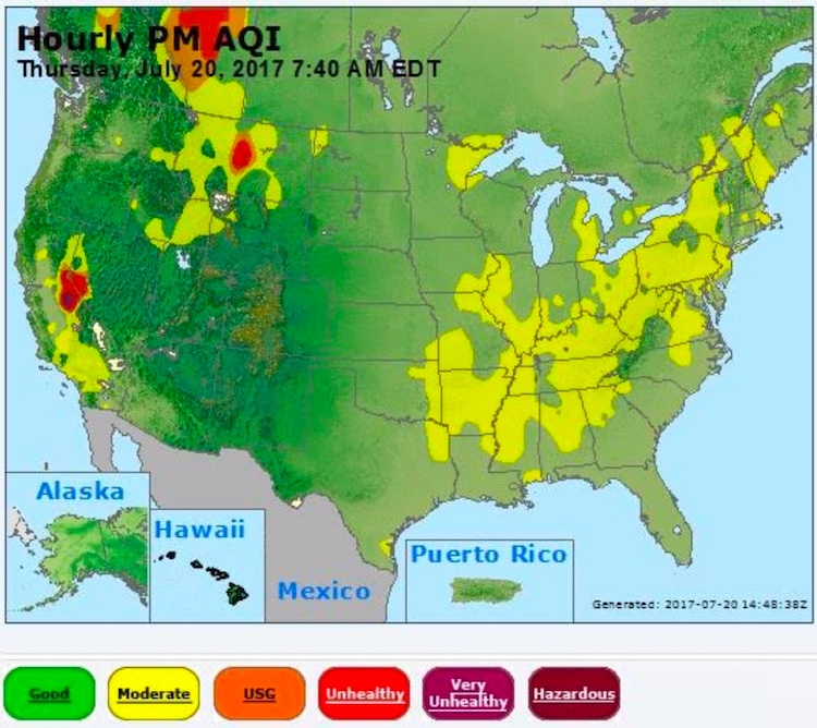 Figure 2. Concentrations of fine particles less than 2.5 microns in diameter (PM2.5) observed on Thursday, July 20, 2017, at 7:40 am EDT. Smoke from a fire in Central California was creating PM2.5 levels in the purple “Very Unhealthy” range near Yosemite National Park, and smoke from fires in British Columbia were causing PM2.5 levels in the red “Unhealthy” range in central Montana and over much of Alberta, including the city of Edmonton. Image credit: U.S. EPA. |