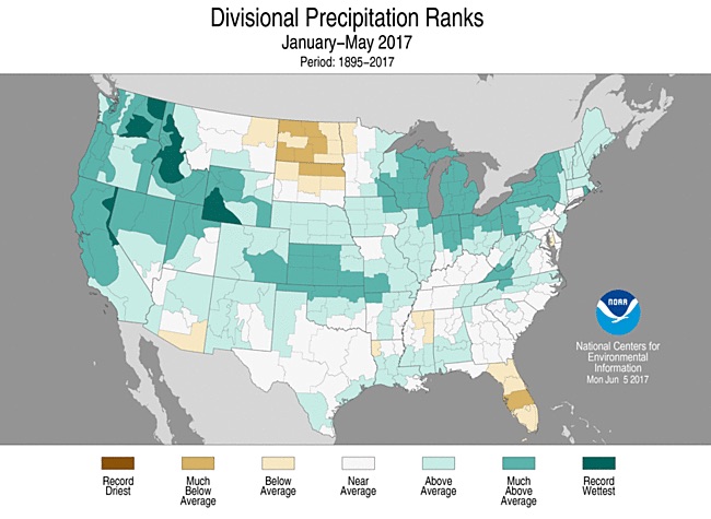 | Figure 3. Parts of four U.S. states had their wettest January-to-May period in more than a century of recordkeeping. Image credit: NOAA/NCEI. |