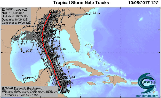| Figure 6. The 0Z Thursday October 5, 2017 track forecast by the members of the GFS model ensemble. Only about two-thirds of the GFS ensembles brought Nate into the Gulf of Mexico as a tropical storm, and none brought Nate to hurricane strength. Image credit: CFAN |