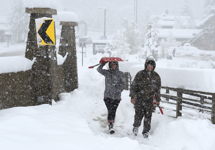 | Figure 3. Emily Weir, left, and Barrac Elgee, head to their home for snow shoveling during a steady snow in Nederland, Colo., on Thursday, May 18, 2017. A rare May snow dump across Colorado prompted some emergency warming shelters to re-open after being closed for the season. Image credit: Cliff Grassmick/Daily Camera via AP. |