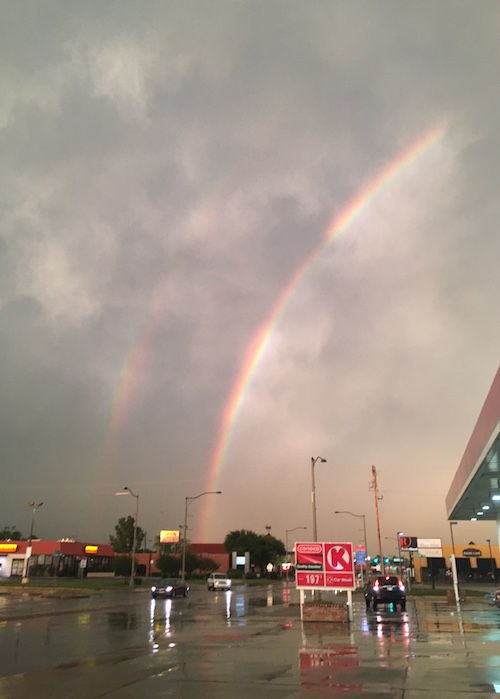 | Figure 2. This rainbow emerged around 8:00 pm Thursday after an intense thunderstorm squall produced heavy rain and winds topping 60 mph in Norman, OK. Image credit: Bob Henson. |